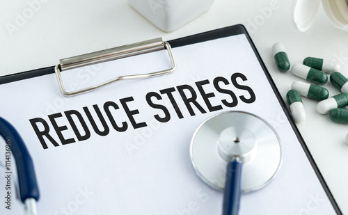 REDUCE STRESS text on a clipboard paper with laptop, mouse and pen .