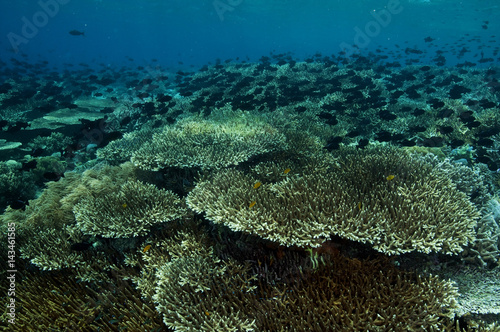 Reef scenic with Acropora hard corals and Black triggerfish, Melichthys niger, school Sulawesi Indonesia