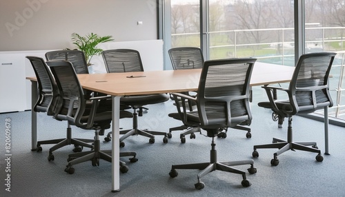 Refined Collaboration: A Minimalist Conference Room Interior Design"chair, table, room, office, interior, business, meeting, desk