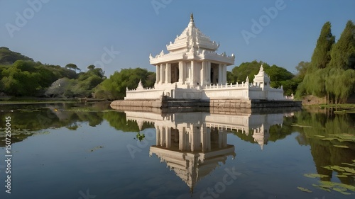 Reflection of a Classic White Stone Temple in a Peaceful Pond