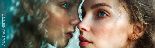 Reflection of a young woman with striking blue eyes in a puddle during a cloudy day