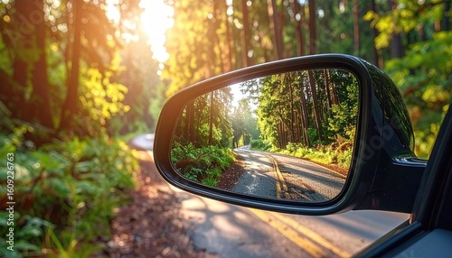 Reflection of Scenic Forest Road in Side Mirror of a Car