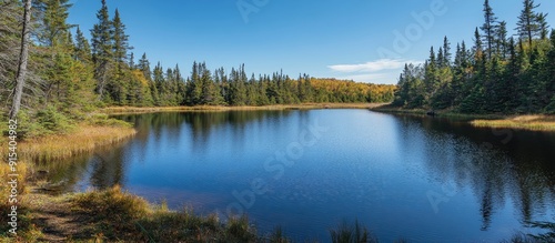 Reflections of a coniferous forest along the edge of an empty lake crisp air in the outdoors a sizable pond located in a deciduous forest with green trees encircling the pond. with copy space image