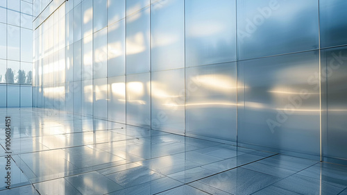 Reflections of light dance on an urban glass facade at sunrise