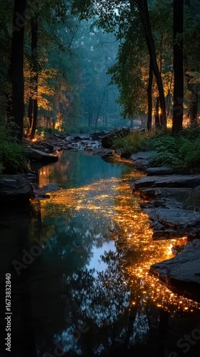 Reflections of shimmering light dance on a peaceful stream at twilight in a forest setting