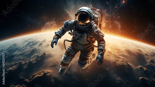Reflections of stars, a galaxy, a purple and blue nebula, and galaxies in an astronaut's helmet while he is in space.