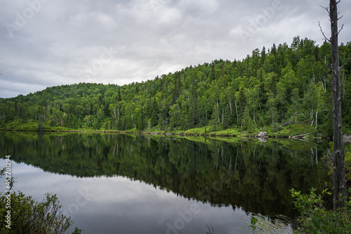 Reflections on a cloudy day in the waters of the small Lac des Pères at the beginning of Pic de la Tête de Chien hiking trail in Monts Valin National Park in Quebec (Canada)