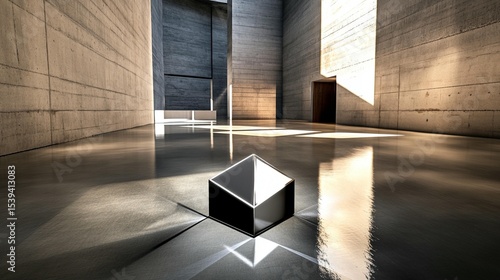 Reflective cube in modern minimalist interior space