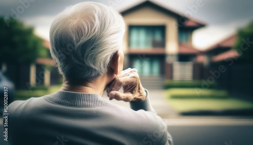 Reflective elderly man observes home from garden bench suburban neighborhood calm atmosphere