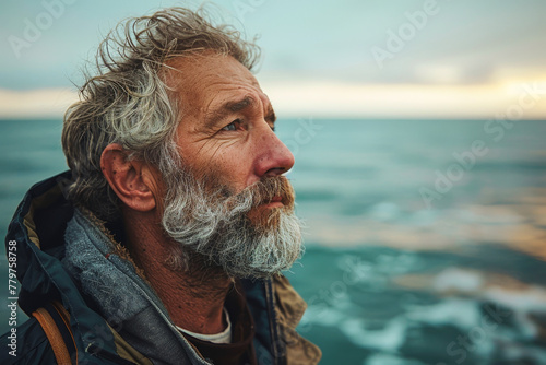 Reflective Elderly Seaman Gazing Towards the Sea at Sunset