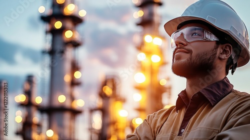 Reflective Engineer at Dusk: A thoughtful male engineer, wearing a hard hat and safety glasses, stands with arms crossed against the backdrop of a brightly lit refinery at twilight.