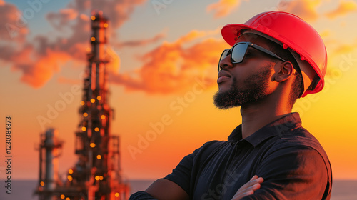 Reflective Industrial Worker: A portrait of a confident male industrial worker, wearing a red hardhat and sunglasses, standing against the backdrop of an illuminated refinery at sunset.