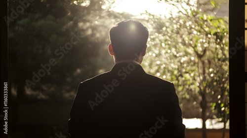 Reflective Man in Suit Gazing at Sunset in Peaceful Natural Setting : Generative AI