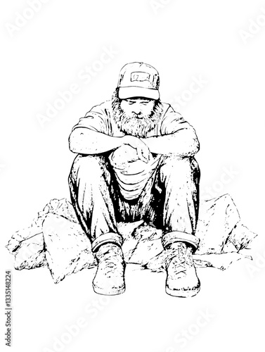 Reflective moment in nature featuring a man lost in thought while sitting on rocks