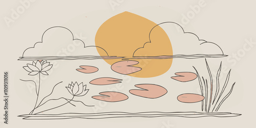 Reflective Pond The individual stands beside a still pond where the clear blue sky and fluffy white clouds are mirrored on the waters surface. Lily pads and delicate water lilies