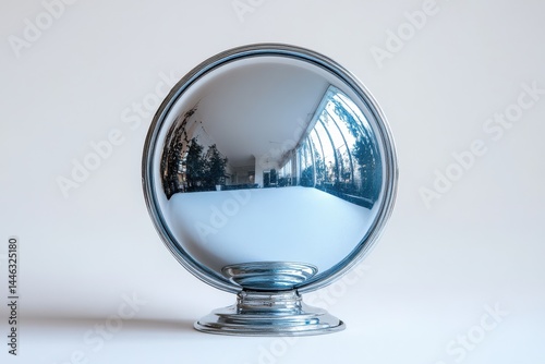 Reflective silver orb mirroring winter scene elegant design cool tones detailed reflection