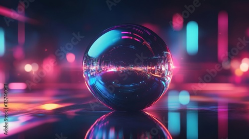 Reflective sphere displays city night bokeh background