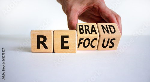 Refocus and rebrand symbol. Businessman turns cubes and changes the word 'refocus' to 'rebrand'. Beautiful white table, white background. Business, refocus and rebrand concept. Copy space.