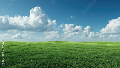 Refreshing And Comfortable Feeling With Panorama Green Grass Field And Blue Sky With White Clouds In Outdoor Landscape. A Picturesque Outdoor Scene.