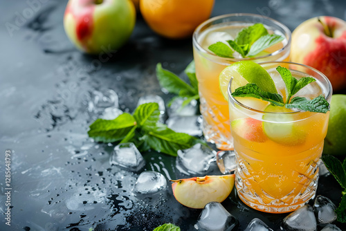 Refreshing apple cocktails with mint garnish and ice, surrounded by fresh apples on a dark surface