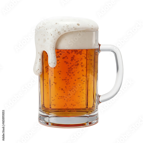 Refreshing beer mug filled with golden liquid and abundant foam overflowing on a clean transparant background