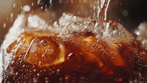 Refreshing brown beverage with ice cubes being poured into a glass.