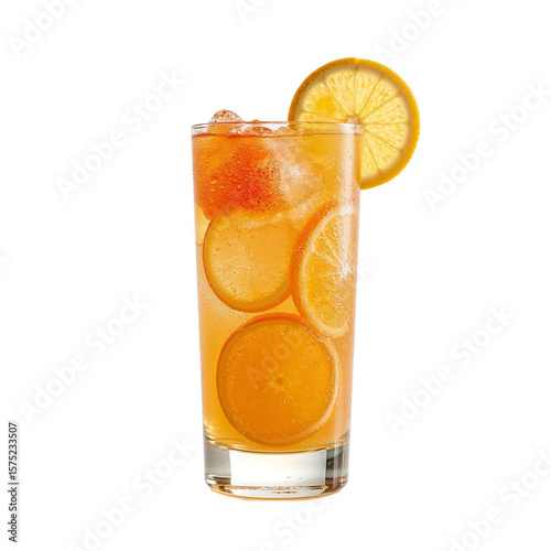 Refreshing citrus beverage with orange and lemon slices, served cold in a glass against a transparent background, perfect for summer.