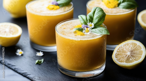 Refreshing citrus cocktail in glasses garnished with basil leaves and flowers, surrounded by fresh lemon halves on a dark slate background.
