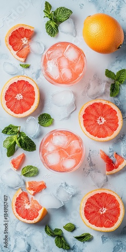 Refreshing Citrus Delight Chilled Grapefruit Beverage with Ice and Fresh Mint, Overhead View