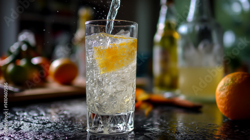 Refreshing citrus drink: A glass of sparkling water with orange slice, perfect for a summer day.