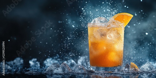 Refreshing cocktail splashing in a glass with ice and orange garnish on a dark background