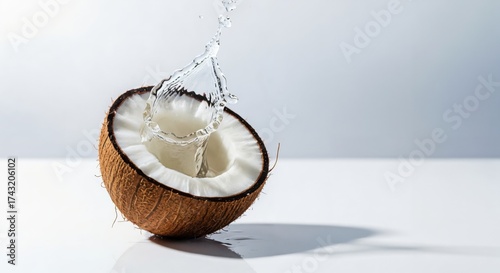 Refreshing coconut water splashing into a freshly cut half coconut on a clean white background, highlighting natural hydration.