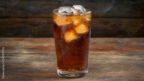 Refreshing Cola Drink with Ice Cubes in Glass on Wooden Table
