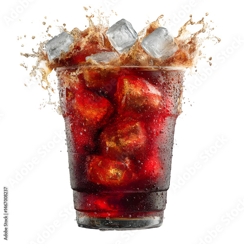 Refreshing Cola Drink with Ice Cubes Splashing in a Plastic Cup