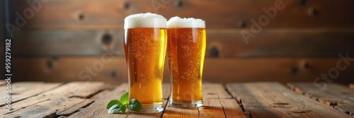 Refreshing craft beers with frothy heads, served in glasses on a rustic wooden table, perfect for pubs, breweries, and beverage promotions.