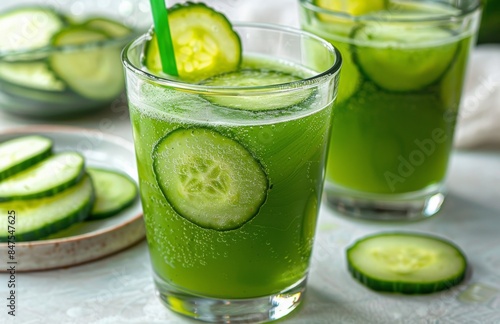 Refreshing Cucumber and Green Juice With Sliced Cucumber Garnish