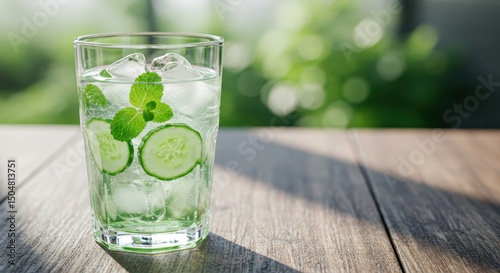 Refreshing Cucumber Mint Drink in a Glass with Ice Cubes on a Wooden Table Surrounded by Lush Greenery and Natural Light