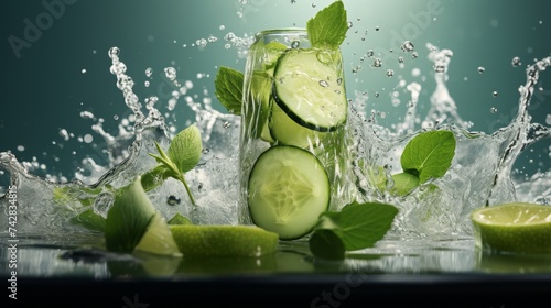 Refreshing Cucumber Slices, Mint Leaves, and Water Splash in a Glass