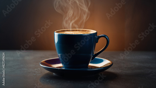 refreshing cup of steaming coffee in blue mug on a saucer in studio background