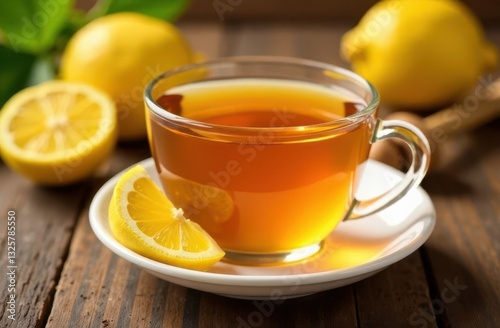 Refreshing cup of tea with lemon on rustic wooden table setting