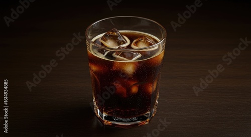 Refreshing Dark Drink in a Glass with Ice Cubes on Dark Wood