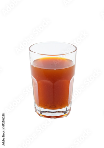 Refreshing drink in clear glass, translucent liquid with a reddish-brown hue. Simple, clean, studio shot