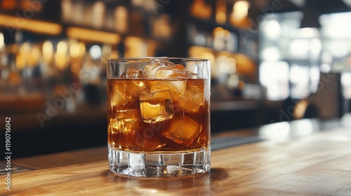 Refreshing Drink on a Wooden Bar Counter in a Cozy Pub Setting