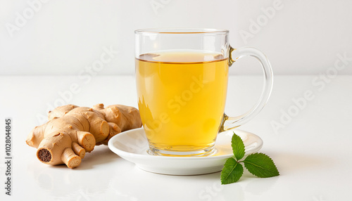 Refreshing ginger tea served in a clear glass mug with fresh mint and ginger root on a white background