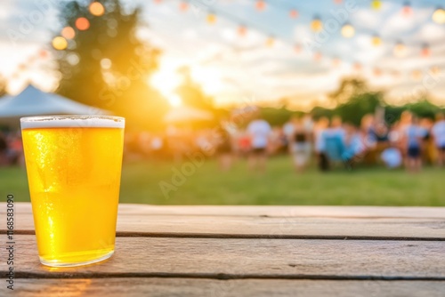 Refreshing Glass of Beer on Wooden Table at Outdoor Summer Event with Party Atmosphere