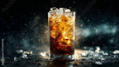 Refreshing glass of iced beverage with ice cubes glistening in soft light against dramatic dark background, perfect for summer or party themes