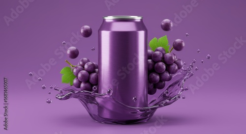 Refreshing grape drink in purple can with juice splash and vibrant grapes for advertising design