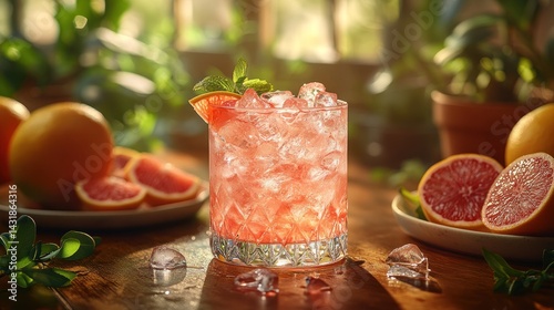 Refreshing grapefruit cocktail with ice on wooden table surrounded by fruit.