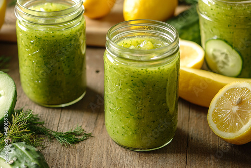 Refreshing green smoothie in jars with cucumbers lemons and dill