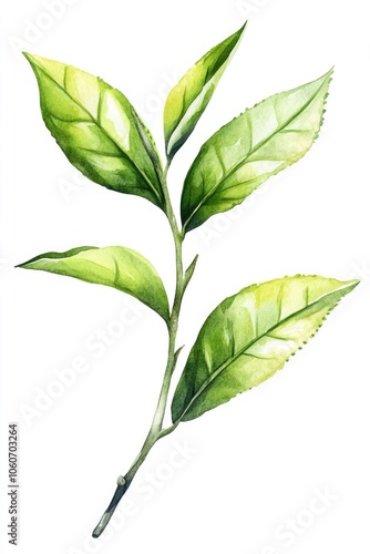 Refreshing Green Tea Leaves. Hand-painted Watercolor Illustration on White Background